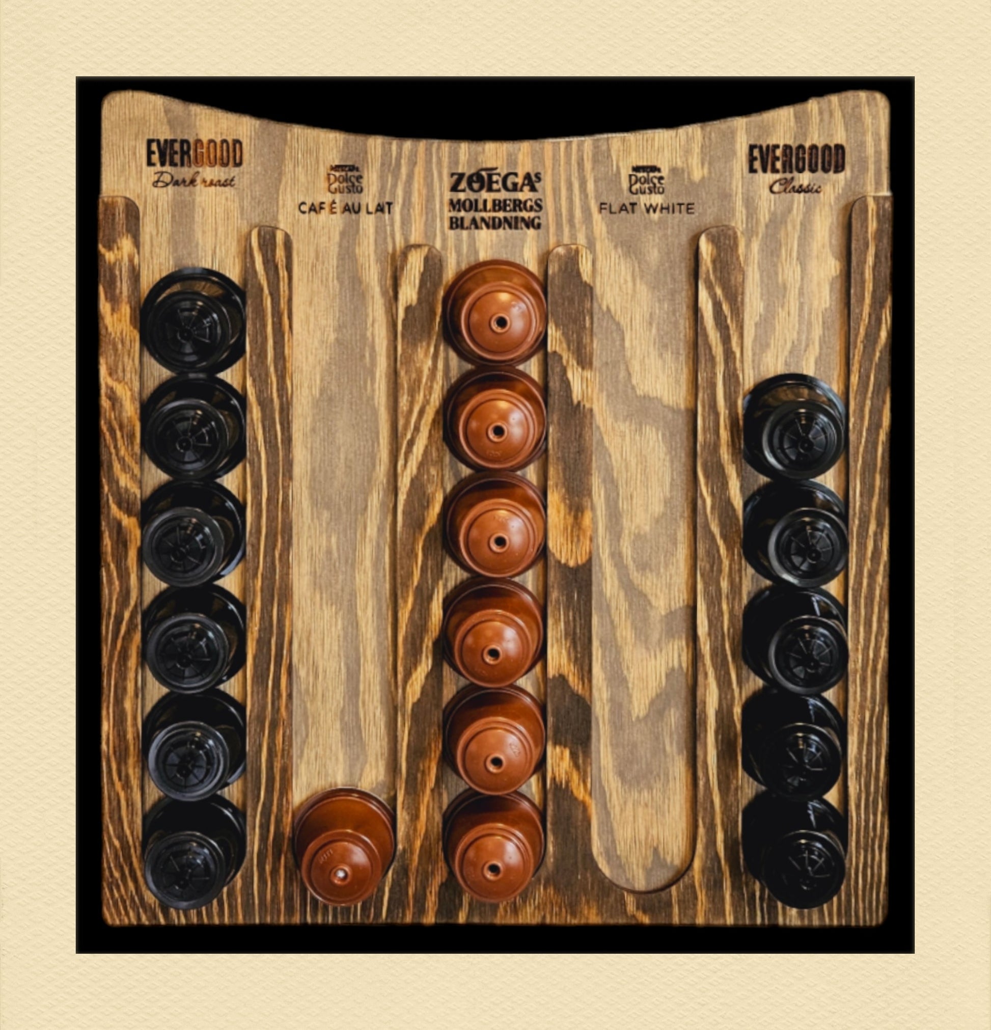 Personalized coffee pod holder in plywood. Possible to order it as is and without names. It can also be ordered in different finishes, sizes and number of columns etc. Model is compatible with Dolce gusto coffee pods.
