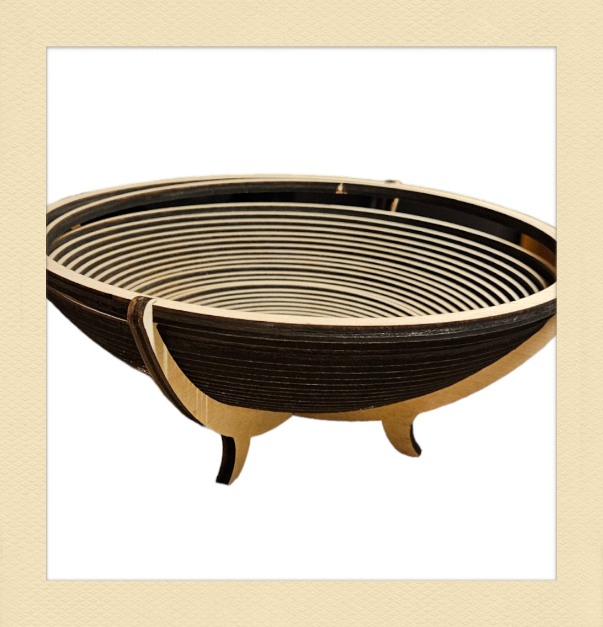 A spiral bowl made in MDF which is aesthetically pleasing. Can be used to put small things, as a fruit bowl for light fruits or just a decor piece.